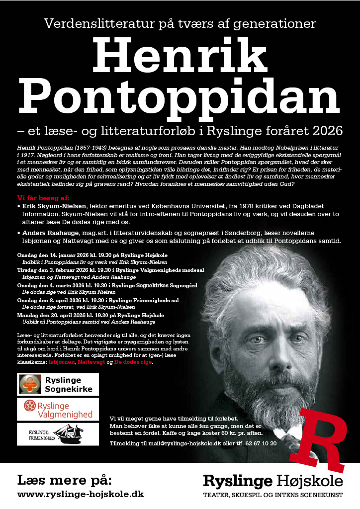 Disse spørgsmål og temaer er lige så aktuelle nu, som for 100 år siden, og det er grunden til, at vi til vinter her i Ryslinge skal læse Henrik Pontoppidan.